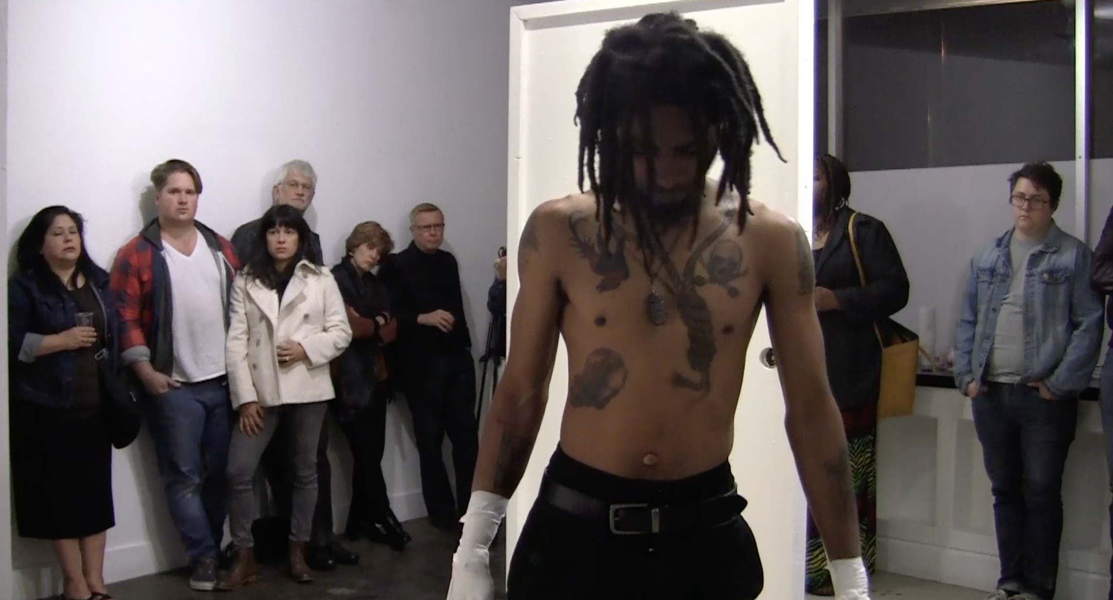 I wanted to create a space where it would be acceptable for an adult to throw a fit. More specifically, where; I, a black man, could let my furious indignation toward white power structures be seen, felt, and heard. To act out that violent anger freely and loudly. Organized chaos in a contained place. The gallery became a gladiator arena. Guest and attendees became spectators and witnesses as my confined black body moved between the two sturdily built white doors—my opponents. Two against one. Like the reality I was attempting to reflect odds; were stacked against me.